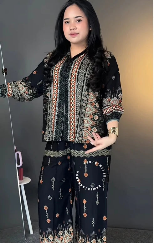The wide-leg palazzo pants flow gracefully, enhancing your overall look while ensuring all-day comfort. The coordinated design creates a perfectly balanced and flattering outfit.